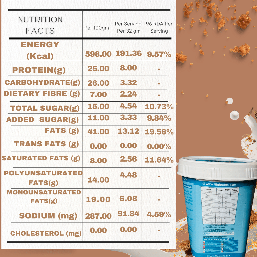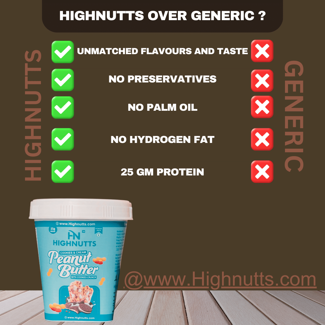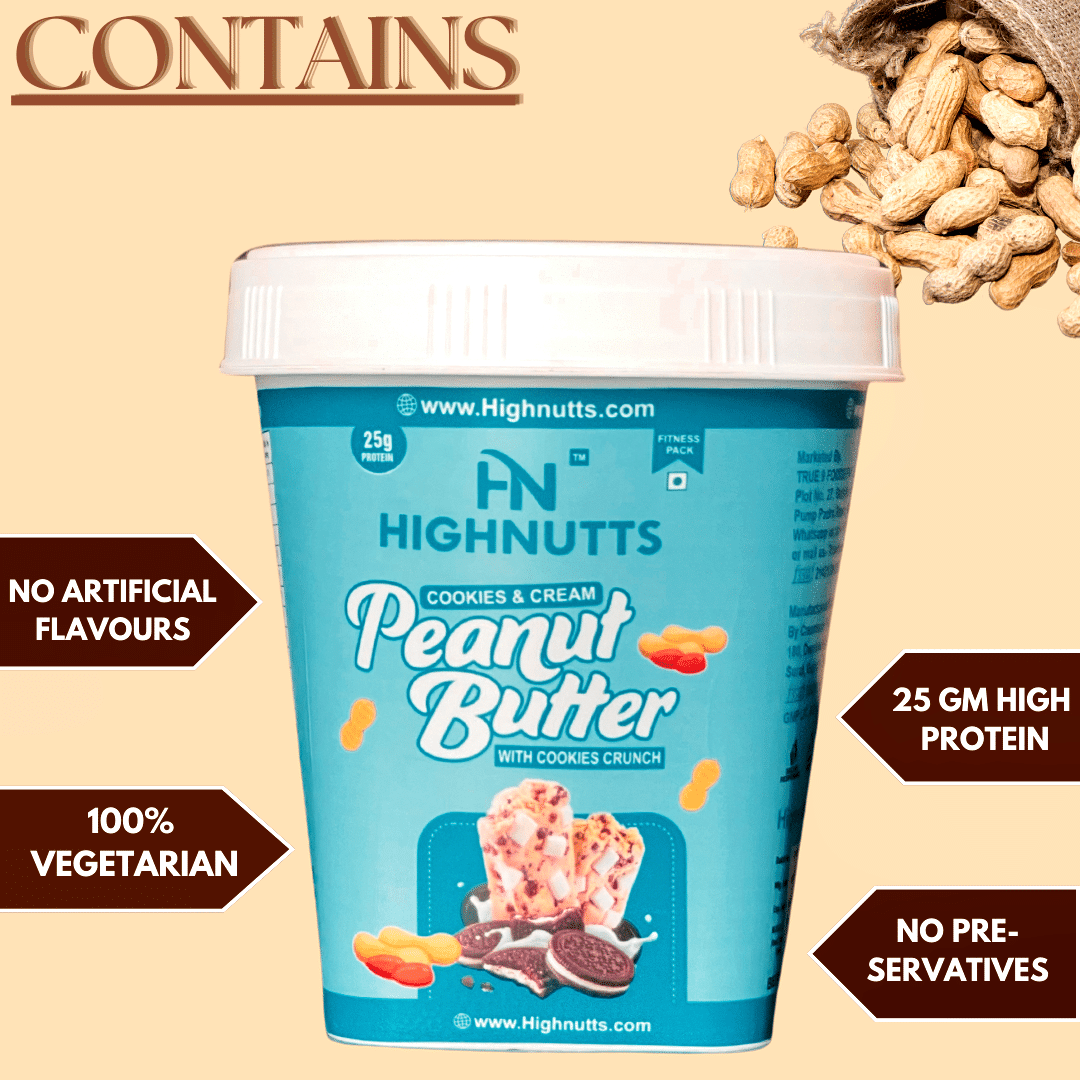 HighNutts Cookies & Cream Peanut Butter is a delicious fusion of roasted peanuts blended with irresistible cookies and creamy goodness, designed for both taste and nutrition. Packed with protein, healthy fats, and dietary fiber, it offers the perfect balance of energy and indulgence. This spread is smooth, slightly crunchy with cookie bits, and ideal for fitness enthusiasts, dessert lovers, and anyone looking for a healthier snack option.Enjoy it on bread, oats, smoothies, or straight from the jar—it’s a guilt-free treat that satisfies sweet cravings while fueling your body with natural energy. With no artificial flavors and made from premium ingredients, HighNutts Cookies & Cream PB is the ultimate spread for power and taste combined.